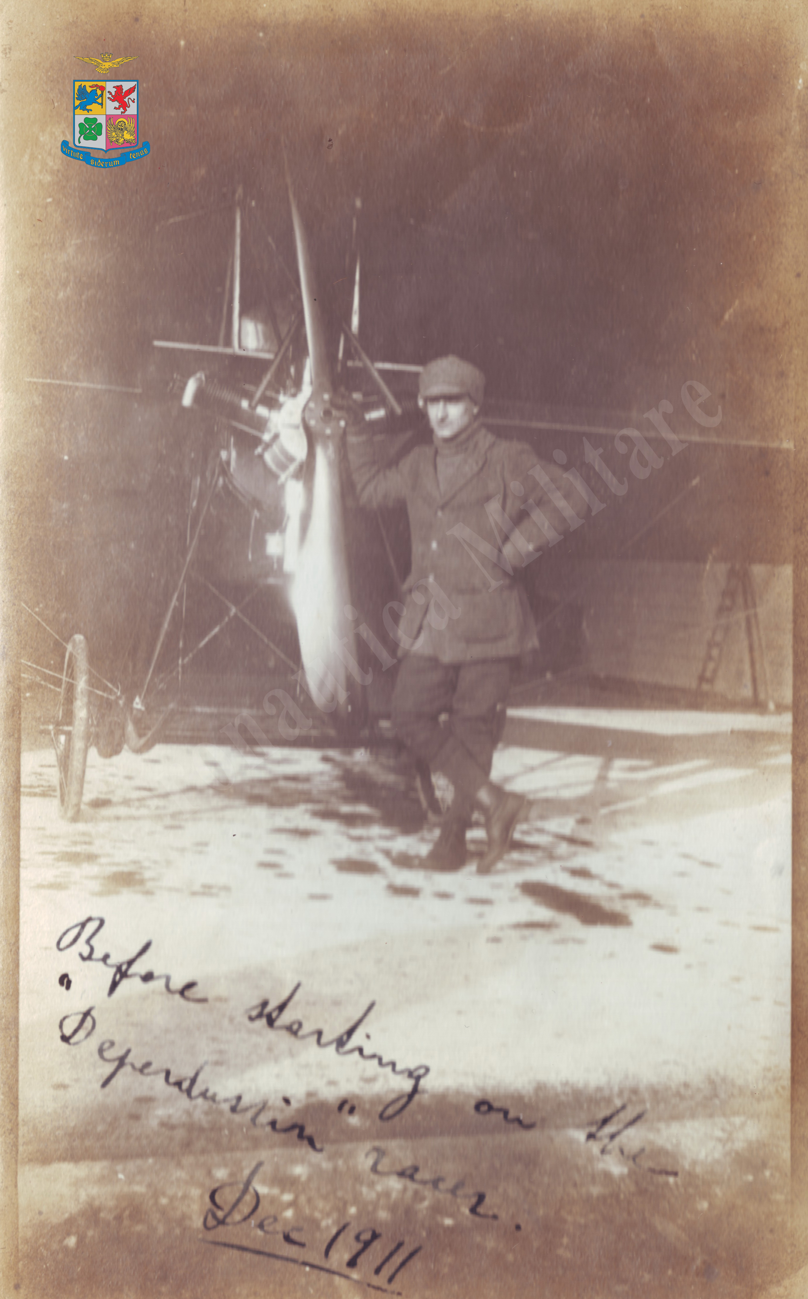 • Giovanni Sabelli a figura intera in posa fotografica davanti ad un velivolo Deperdussin, Gelatina ai sali d'argento, CC BY-SA