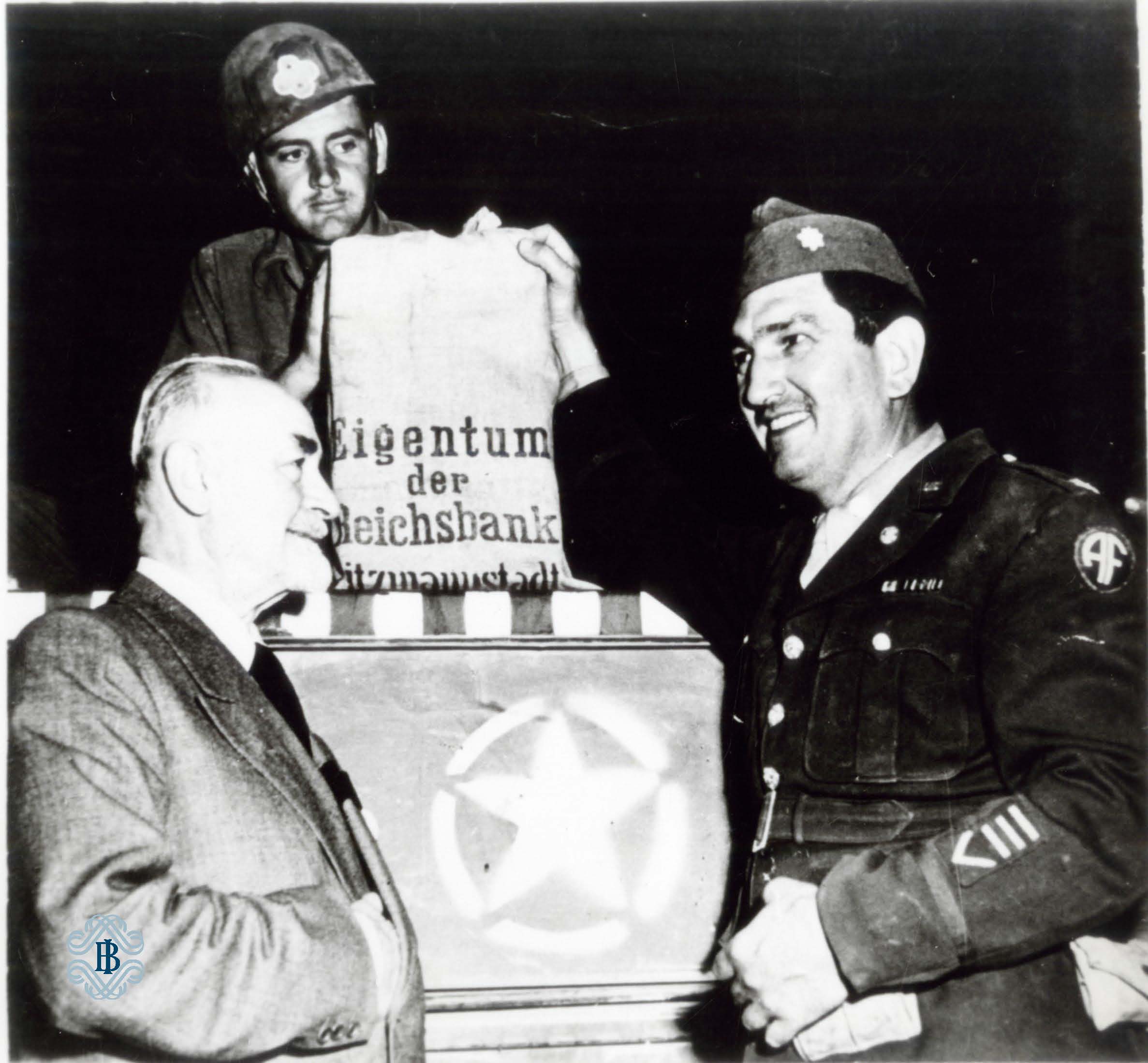 • Niccolò Introna con il colonnello James H. Penick in occasione del rientro nella sede centrale della Banca d'Italia dell'oro ritrovato a Fortezza il 17 maggio 1945, 1945, gelatina ai sali d'argento, CC BY-NC-ND