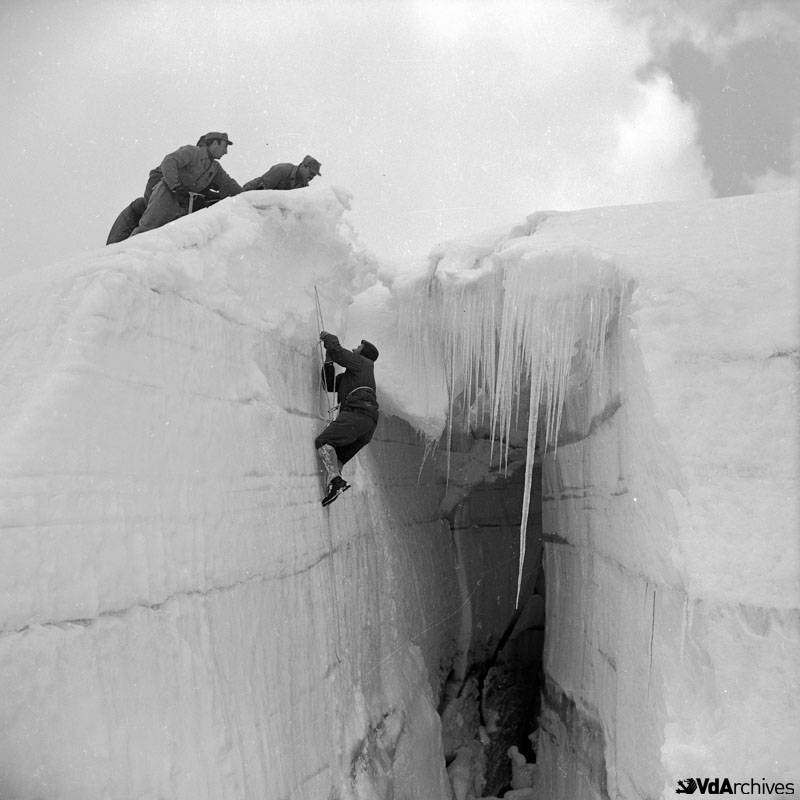 • Giuseppe Lucca, Esercitazione di soccorso in un crepaccio nel ghiacciaio di Toule a Courmayeur, 1962, Negativo gelatina-bromuro su pellicola, CC BY-NC-SA