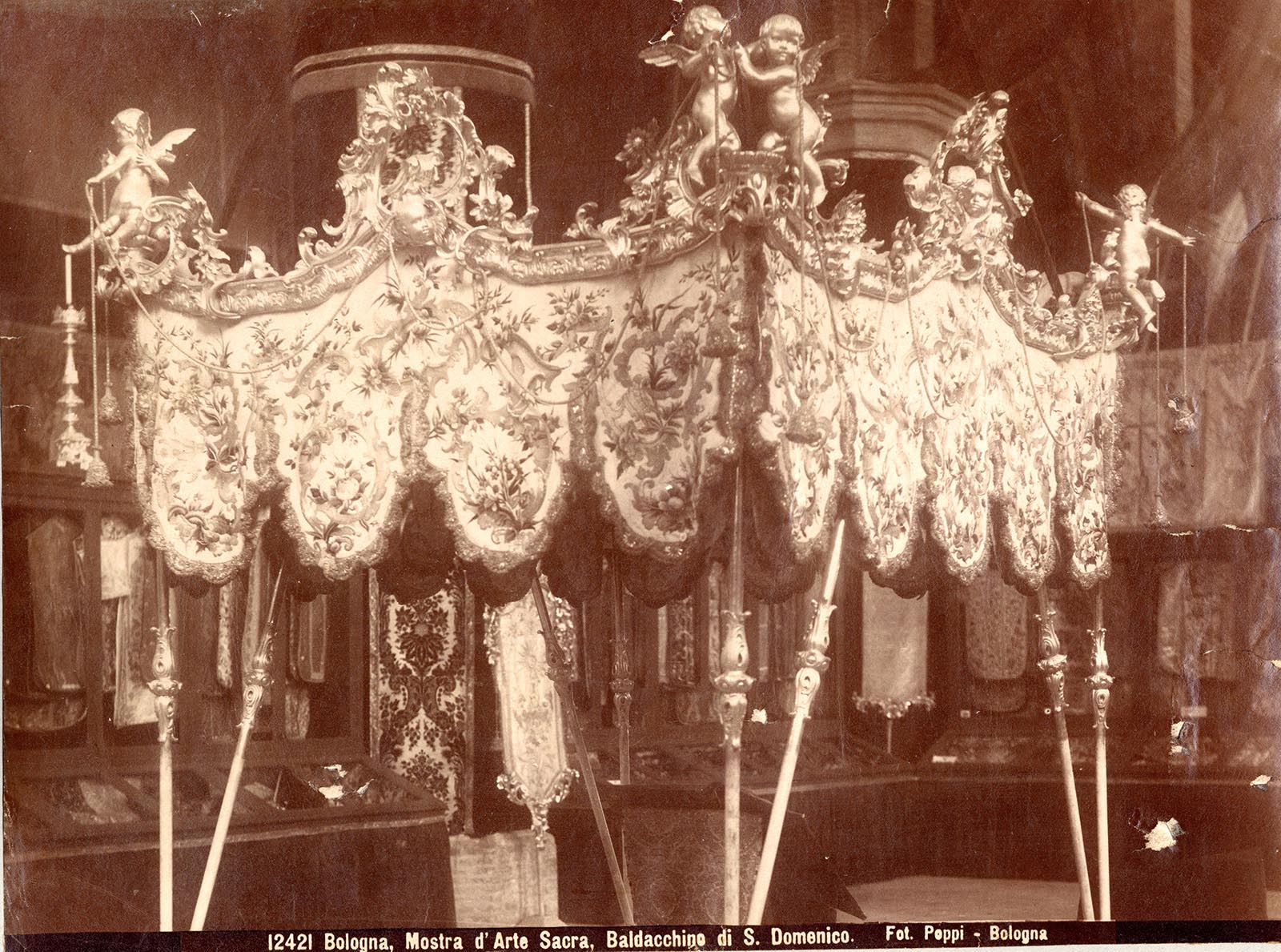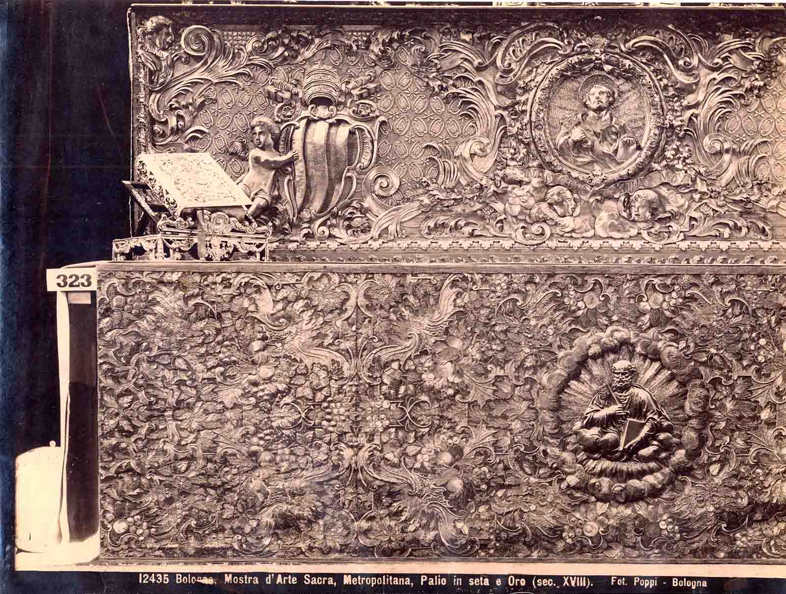 Pietro Poppi fu il fotografo ufficiale dell’imponente e pioneristica Mostra d’arte sacra di materiali diocesani, prestati dalle chiese della città, del suburbio, della campagna, da opere pie e da privati”(Marzocchi, 1997). Realizzò in quell’occasione 75 scatti che integrò con riprese precedentemente eseguite ad oggetti prescelti per l’esposizione. Né poteva essere altrimenti, non solo per il ruolo di Poppi che certamente a quelle date era il più affermato fotografo bolognese, ma anche per la sua inclinazione a restituire della città (allora “rubbianesca” come peraltro la mostra e della quale dunque San Francesco rappresentava il cuore) un tessuto visivo attento non solo alle emergenze monumentali, ma anche al tessuto minore ma continuo del quale cogliere mediante selezione visiva e scelte luministiche, tutta la suggestione materiale. La mostra, annunciando scelte e criteri che di lì a poco maturano nel progetto del Museo Davia Bargellini, rilancia il tema anche fotografico dell’ornato come modello per l’artigianato già ben testimoniato nelle fotografie di Poppi. Almeno dagli anni ’80 il tema è presente anche nei cataloghi Alinari, forse con una logica di riproducibile grammatica formale più che di restituzione dell’integrata patina storica come nelle fotografie di Pietro Poppi.