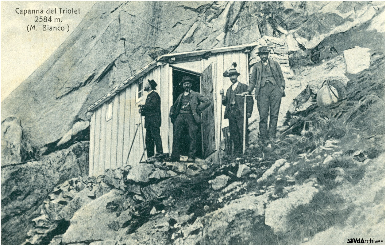 • Autore non identificato, Alpinisti alla capanna del Triolet a Courmayeur, 1915 circa, Cartolina postale, CC BY-NC-SA